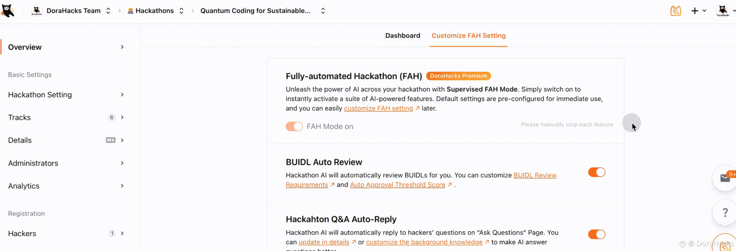 FAH provides an entirely new level of capabilities to DoraHacks hackathon communities and DoraHacks hackathon organizers. It also brings all existing Hackathon AI features into one place, giving you a simple way to turn automation on and stay in control from the Dashboard. It helps you run more hackathons, and more scalable hackathons. Try it today!