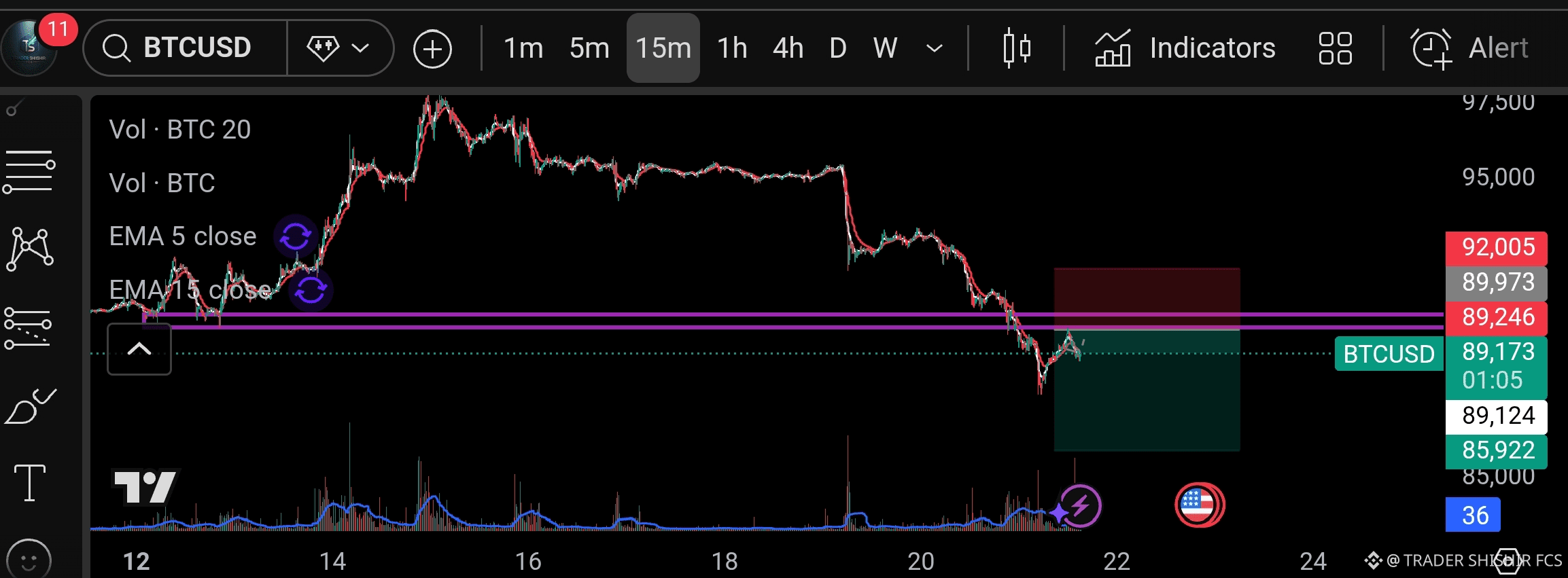 15m chart-e price ekdom key purple support zone ($89,124–$89,246) e test korche – bounce hole up, break hole downside risk!