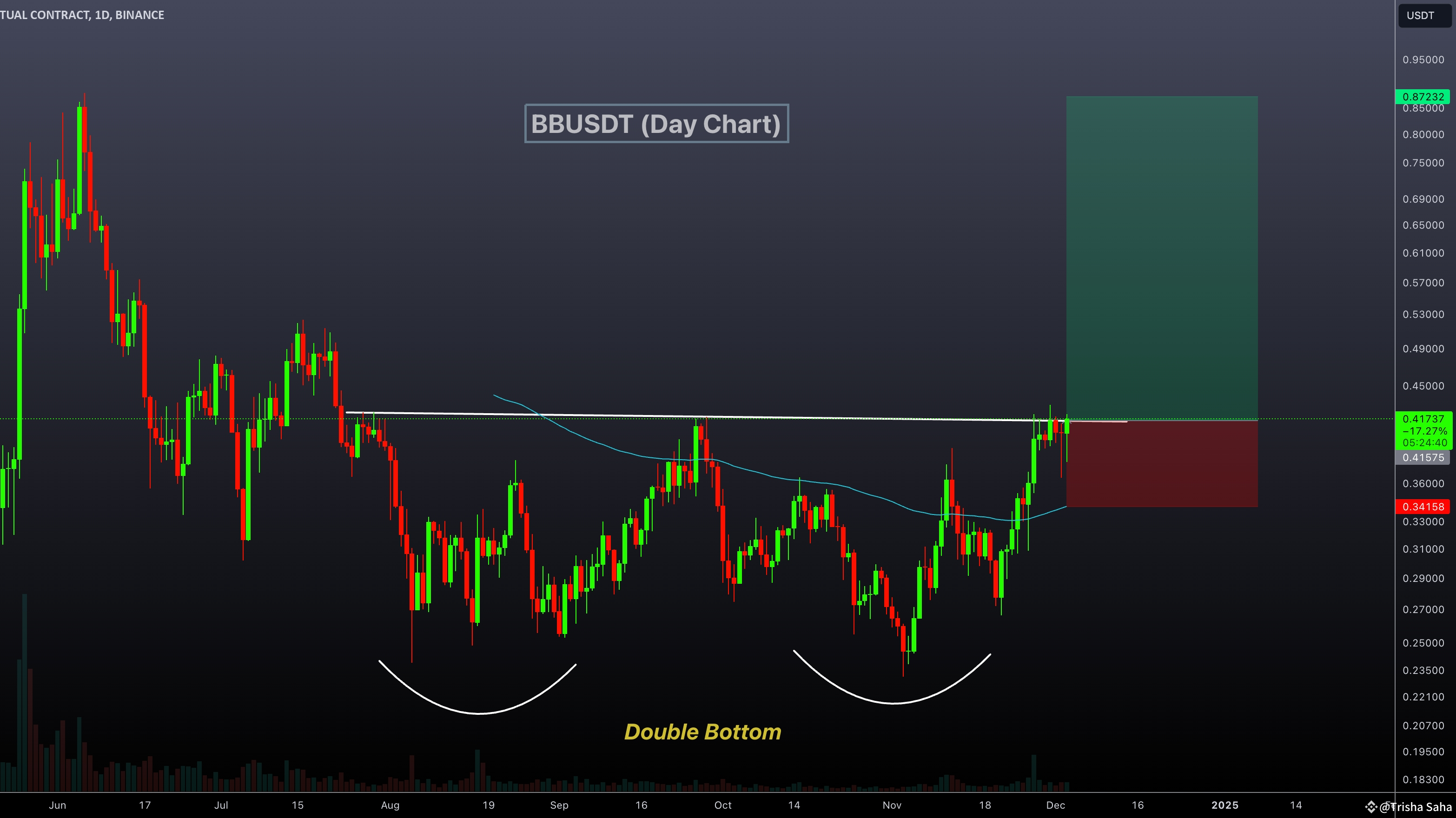 El precio de BBUSDT ha formado un patrón de doble fondo en el gráfico diario. El precio ya ha subido un 80% desde el fondo y ahora se encuentra negociando cerca de la resistencia de la línea del cuello del doble fondo. Además, el precio está por encima de la EMA de 100 en el gráfico diario. Una vez que se confirme una ruptura por encima de la línea del cuello, se puede esperar un fuerte movimiento alcista.