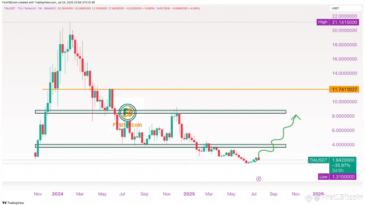 Después de meses de pérdidas, TIAUSDT está rebotando en un soporte clave en $1.30 y mirando hacia una recuperación hacia $8 → $11 📈