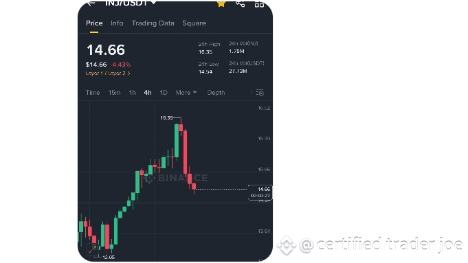 $INJ acaba de hacer un fuerte movimiento al alza, tocando $16.35 antes de retroceder — ahora se encuentra en una zona de soporte clave. Este tipo de rechazo tras un breakout a menudo prepara el camino para la siguiente subida 👀