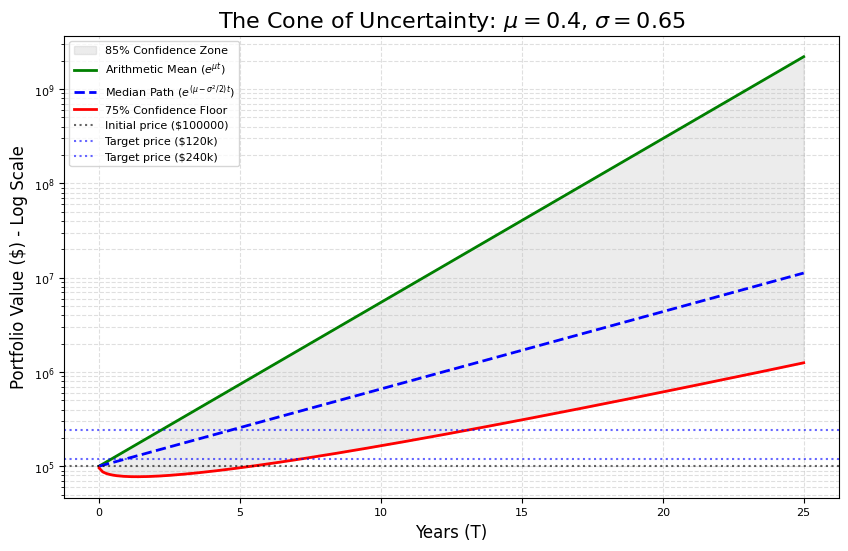 Asume un retorno anual del 40%. ¿Suena optimista? Bien. No olvides la volatilidad, digamos que es del 65%.