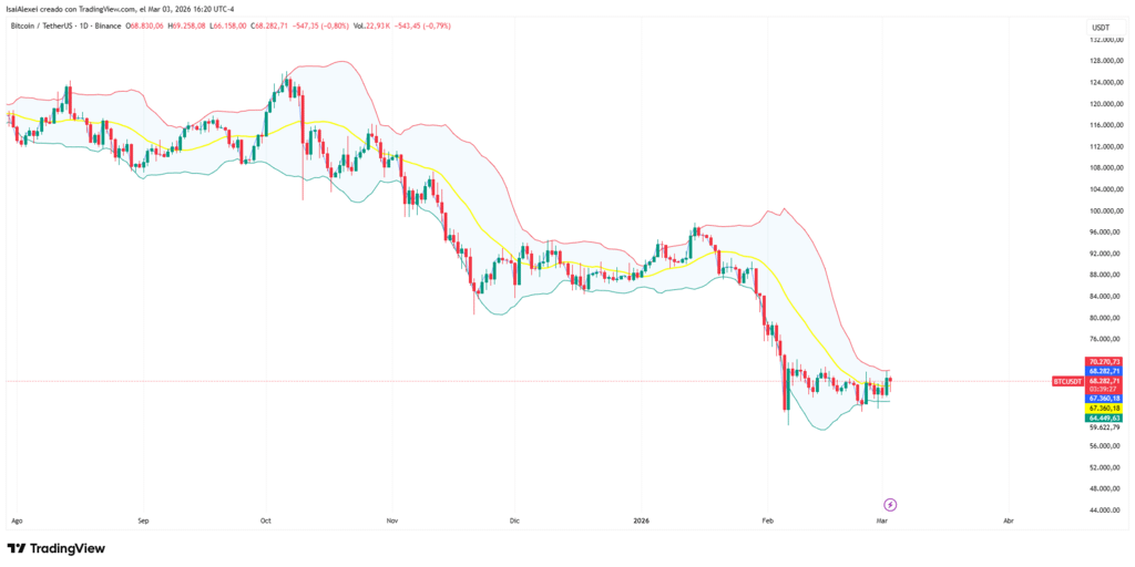 Hacia arriba, la resistencia principal se extiende entre $70,000 y $72,000. Un cierre diario por encima de esa banda, acompañado de un volumen creciente, abriría el camino hacia $76,000. Hacia abajo, el soporte inmediato en $66,500 es crítico. Una ruptura por debajo de ese nivel enviaría el precio a probar la zona de $65,000 primero y luego $62,500.