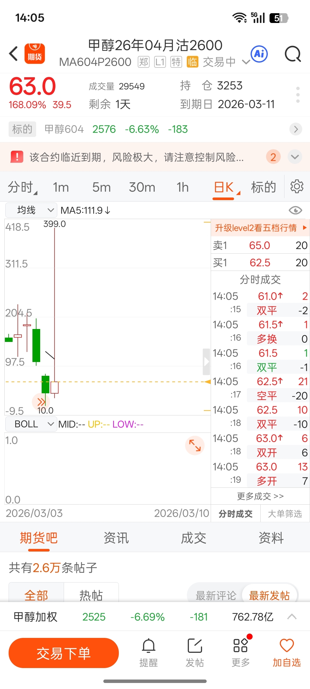 La opción de venta de metanol 2604 a 2,600, ayer costaba 10 yuanes, hoy alcanzó un máximo de 399. Según el precio de ejercicio, ha aumentado casi 40 veces en un día. Incluso si se toma la ganancia a tiempo durante el día, obtener un rendimiento de 30 veces no es un problema.