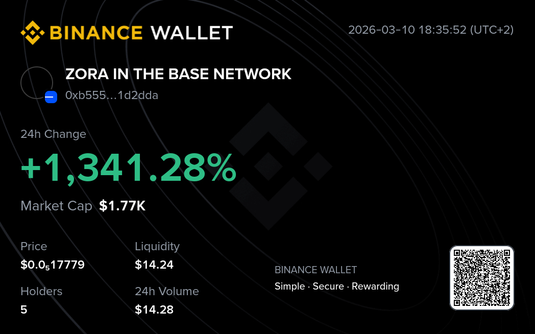 The current price of ZORA IN THE BASE NETWORK (ZORA IN THE BASE NETWORK/USDC) on Uniswap V4 (Base) is $0.000001771, the price is up 1,340.6% in the last 24 hours. Its 24-hour trading volume is reported to be at $14.29 with a total of 27 transactions. ZORA IN THE BASE NETWORK/USDC contract address is 0x2704254461d1b2a27e9bbe0776abfe5e7a90e0cf0d5b5b9b8f48ad9f54322bf0, with a Fully Diluted Valuation (FDV) of $1,770.64 and a liquidity pool of $365.44.