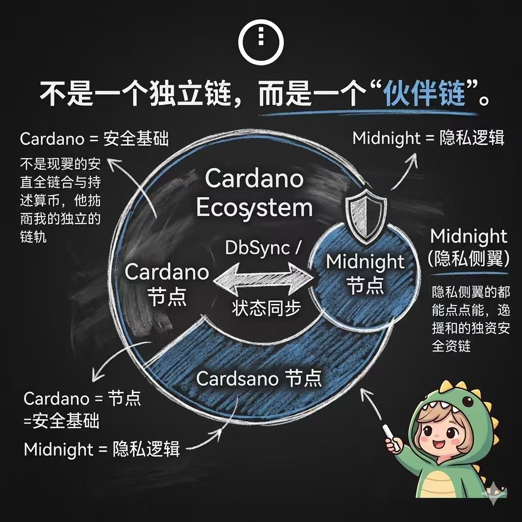 Su consenso, su estado de libro mayor, su finalización, están profundamente vinculados a la red principal de Cardano. Midnight se encarga del cálculo de la privacidad, Cardano se encarga de la liquidación final y la seguridad.