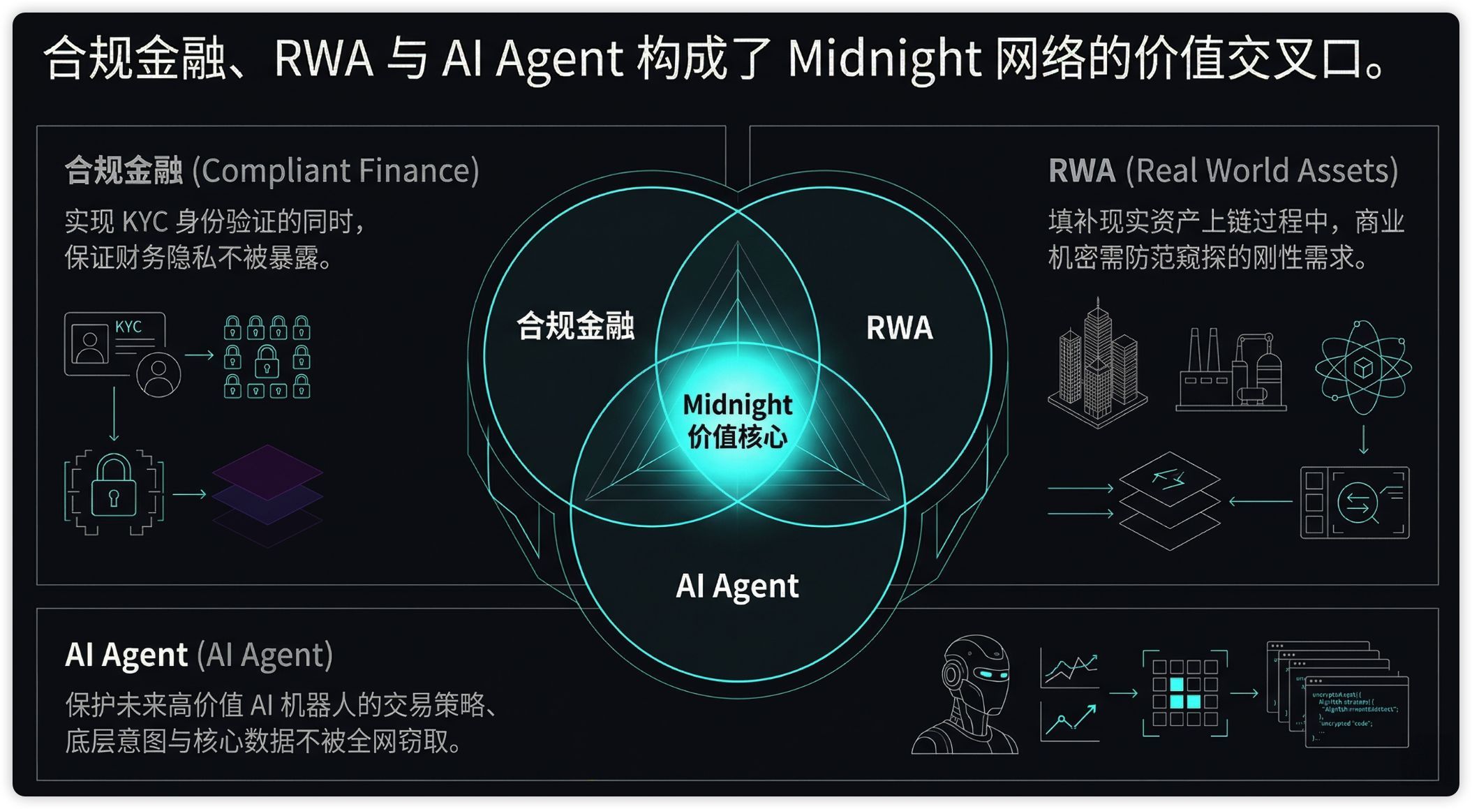 Los escenarios de implementación también son muy prácticos: en escenarios de finanzas conformes, verifican la identidad mientras protegen la privacidad; los activos RWA en la cadena evitan que los datos comerciales sean completamente transparentes; en el ámbito de los agentes de IA, garantizan que las estrategias de transacción y los datos clave no sean espiados por toda la red. Midnight se sitúa justo en la intersección de estas tres direcciones.