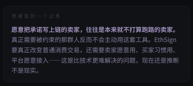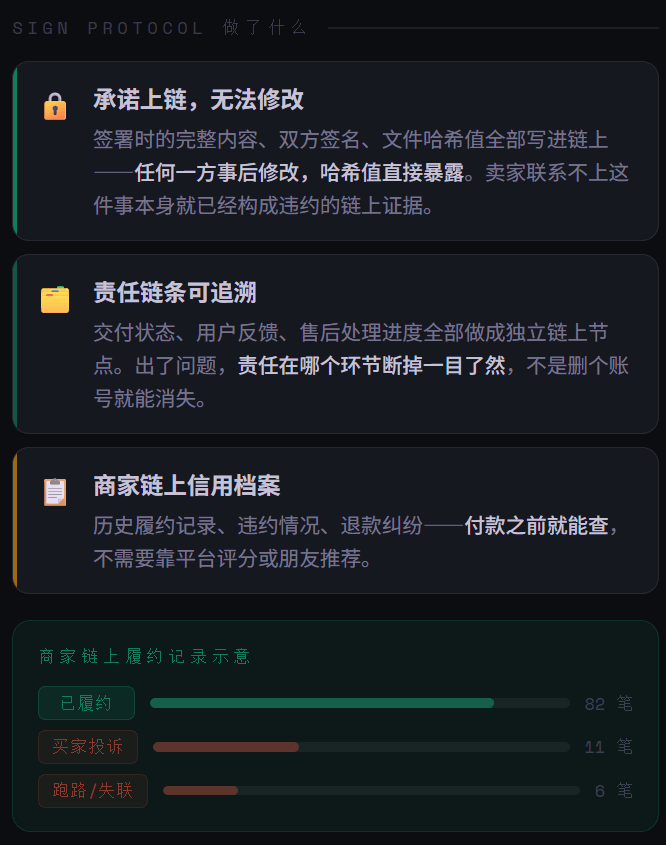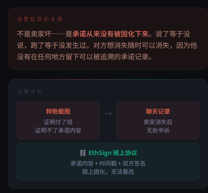 ¿Qué significa esto en el contexto del consumo? Significa que los efectos prometidos, las condiciones de reembolso y los estándares de entrega que el vendedor promete antes de recibir el pago, si se formalizan como un acuerdo firmado en la cadena a través de EthSign, no están en manos del vendedor ni del comprador, sino en la cadena.