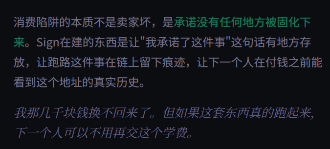 El vendedor no puede desaparecer después y decir "no prometí nada", porque la marca de tiempo y la firma en la cadena están allí y cualquier tercero puede verificarlo. Si hubiera tenido un acuerdo en la cadena como ese por esos pocos miles de yuanes, el hecho de que el vendedor no pudiera ser contactado ya constituiría una evidencia de incumplimiento en la cadena, en lugar de que yo tuviera una captura de pantalla de la transferencia y no tuviera a dónde reclamar.