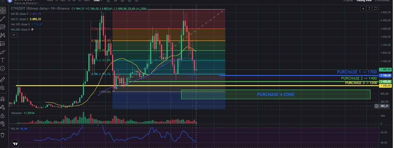 - Última compra con el 20% del capital restante, la ejecutare por debajo de 1000 --> al igual que con BTC esta ultima parte del capital la reservo en caso de que el mercado entre en pánico y se intenten vulnerar los 1000 dolares, lo cual lo veo difícil que ocurra pero no imposible.