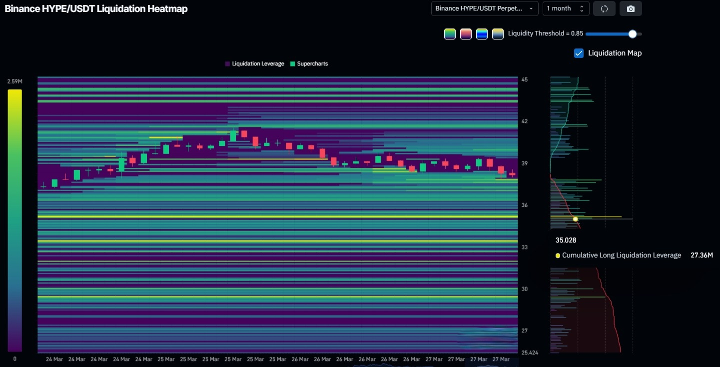 Hay un fuerte cúmulo de liquidaciones largas alrededor de $35. Eso significa que muchos traders están apalancados y posicionados para el alza justo en ese nivel.