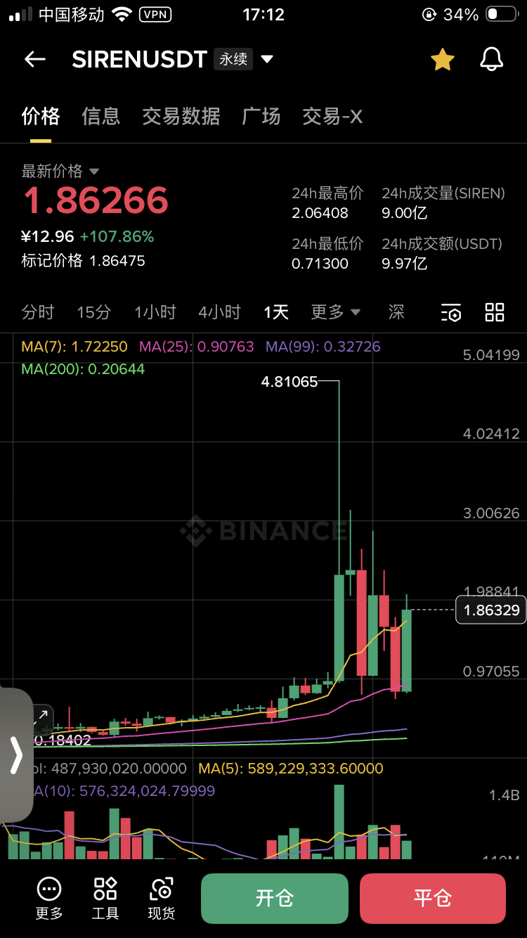 • Características del mercado: SIREN cayó directamente desde un punto alto de 4.81 USDT hasta un mínimo de 24h de 0.713 USDT, con una caída máxima diaria de más del 85%, y luego se disparó violentamente a 2.06 USDT, con un aumento de más del 107% en 24h, replicando perfectamente el rebote después de la primera caída de LYN.