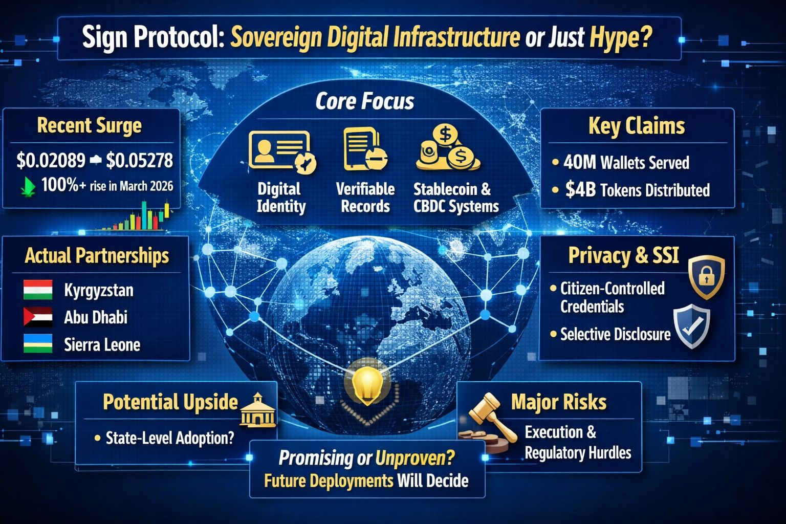 Al final, la historia es simple. Definitivamente hay un bombo alrededor del Protocolo Sign, pero también hay señales visibles de sustancia. Los datos oficiales muestran que ha procesado millones de atestaciones y facilitado miles de millones de dólares en distribuciones de tokens a decenas de millones de billeteras. Al mismo tiempo, sus materiales públicos lo conectan a una visión más amplia que involucra identidad digital, registros soberanos, distribución de beneficios públicos e infraestructura adyacente a CBDC. Sería demasiado pronto para llamarlo completamente probado, pero también sería inexacto desestimarlo como una narrativa vacía. La forma más equilibrada de entender Sign en este momento es así: una apuesta prometedora por la infraestructura soberana cuya verdadera credibilidad será determinada por los hitos de despliegue futuros.