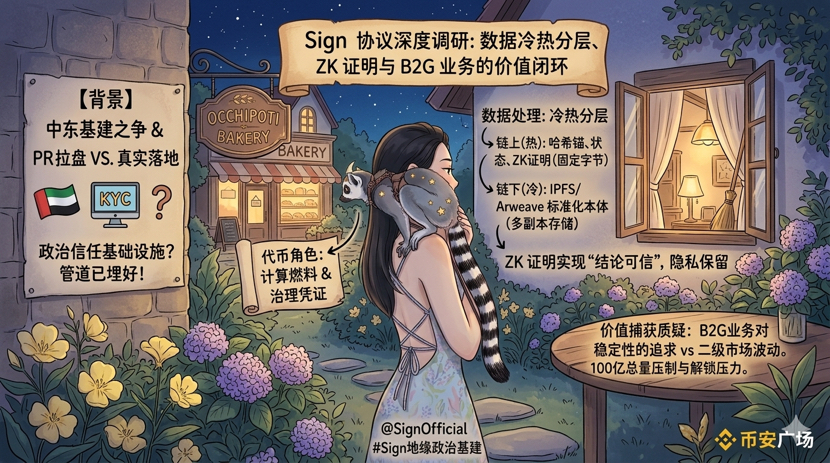 La trampa más fácil de pasar por alto es: si los datos fuera de la cadena se pierden, el hash en la cadena es solo una cáscara vacía. Sign ha cubierto aquí con dos capas, almacenamiento de múltiples copias (datos importantes en Arweave en una capa permanente + respaldo en múltiples nodos), datos poco importantes en L2/L3 ligeros; al mismo tiempo, los nodos son restringidos, el indexador debe poder extraer los datos originales en cualquier momento, no poder hacerlo conlleva multas. Esto no garantiza la inmortalidad de los datos, sino que hace que 'la pérdida de datos' sea extremadamente costosa. A un nivel más profundo, muchos escenarios de cumplimiento (como KYC) no deberían ser públicos. Sign incorpora ZK, completando el ciclo: los datos pueden estar ocultos en el dispositivo del usuario o en un espacio encriptado, la cadena solo prueba 'cumple con ciertas condiciones', y no revela el contenido. Este paso convierte 'confiable' de los datos en sí en 'conclusiones confiables', y los costos en la cadena son completamente controlables. Almacenar hashes es un tamaño fijo de decenas de bytes, sin importar cuán grandes sean los datos, los costos en la cadena básicamente no cambian.