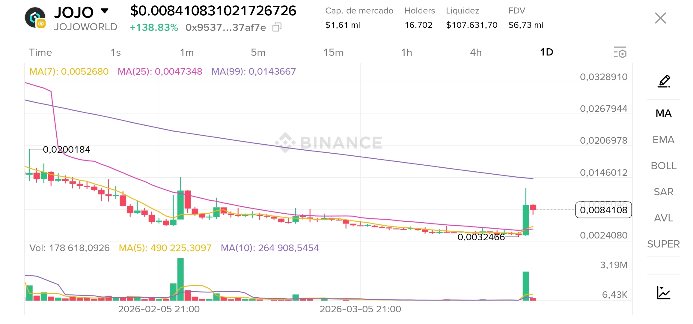 Después de meses de consolidación lateral y caída, el precio dio un pump insano de +138,83% en apenas 24 horas, rompiendo con fuerza hacia arriba de las medias cortas (MA7 y MA25) y saliendo del fondo.