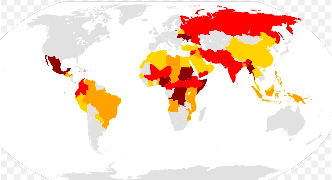 A través de África, el mapa revela una de las regiones de conflicto más intensas a nivel mundial. Los países en el Sahel y África Central muestran colores rojo oscuro, reflejando la violencia en curso, las insurgencias y la inestabilidad política.