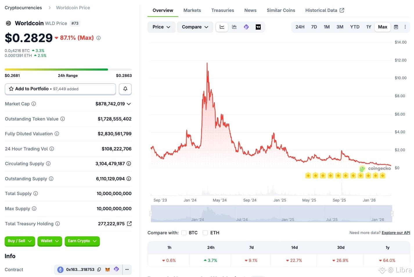 So với mức đỉnh gần 11,82 USD vào tháng 3/2024, token này đã mất khoảng 97% thị giá. Hiện WLD có vốn hóa thị trường khoảng 850 triệu USD, với mức định giá pha loãng hoàn toàn (FDV) là 2,7 tỷ USD.