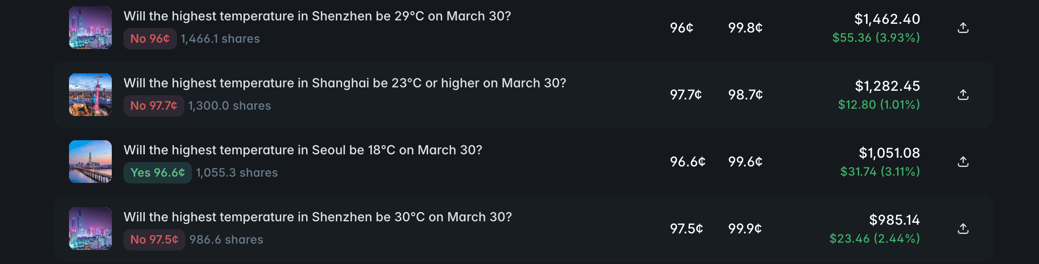 Hoy estoy probando este mercado (30 de marzo, la temperatura máxima en el aeropuerto de Shenzhen es de 27 grados, sin embargo, ha estado lloviendo mucho, en realidad si se alcanzará o no los 28 grados a 27 grados ya tiene un resultado, pero el mercado no ha reaccionado, el espacio de arbitraje es enorme)