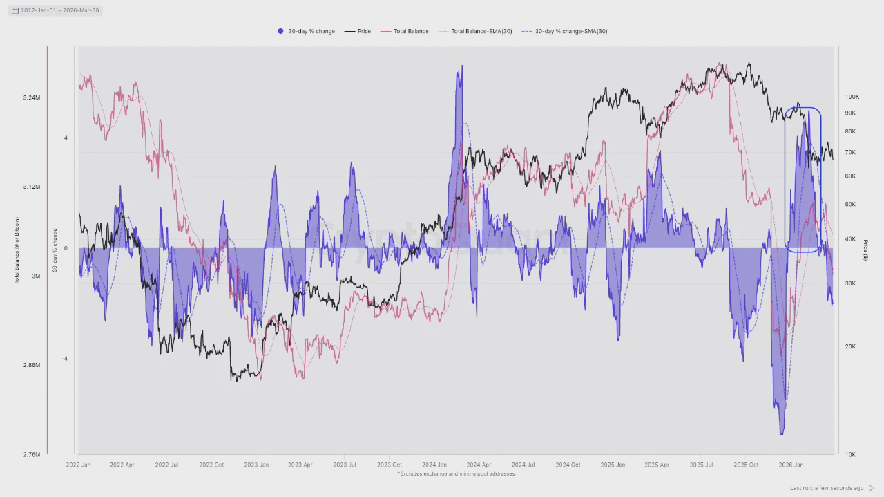 The Whale 30-day percentage change measures the net accumulation or distribution trend among large on-chain Bitcoin addresses. Through early 2026, the indicator showed aggressive accumulation that supported prices. As of mid-March it turned negative. Whale accumulation momentum has exhausted, with some large addresses shifting toward minor distribution.