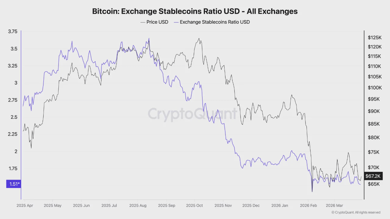 The Exchange Stablecoins Ratio sits at 1.51, a 24-month low. This metric measures stablecoin liquidity on exchanges relative to Bitcoin's price. A high ratio signals abundant capital ready to buy. At 1.51, the stablecoin buffer that would absorb selling pressure and sustain a rally is significantly thinner than at any point in the past two years.