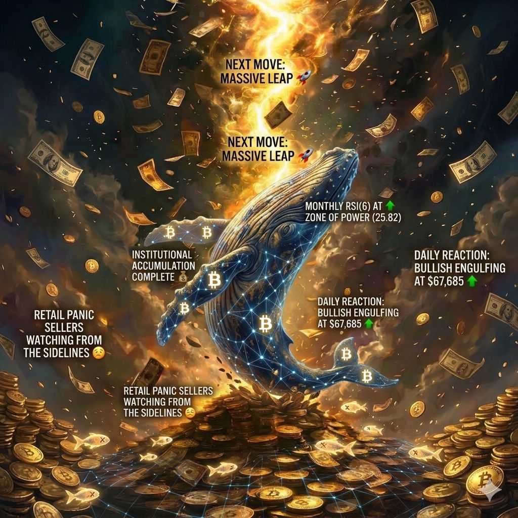 Miren sus gráficas de hoy. Bitcoin cotiza en $67,685.03 (Gráfico 1D), rebotando tras tocar la línea de absorción institucional que marcamos ayer. Es la validación absoluta de nuestra tesis.