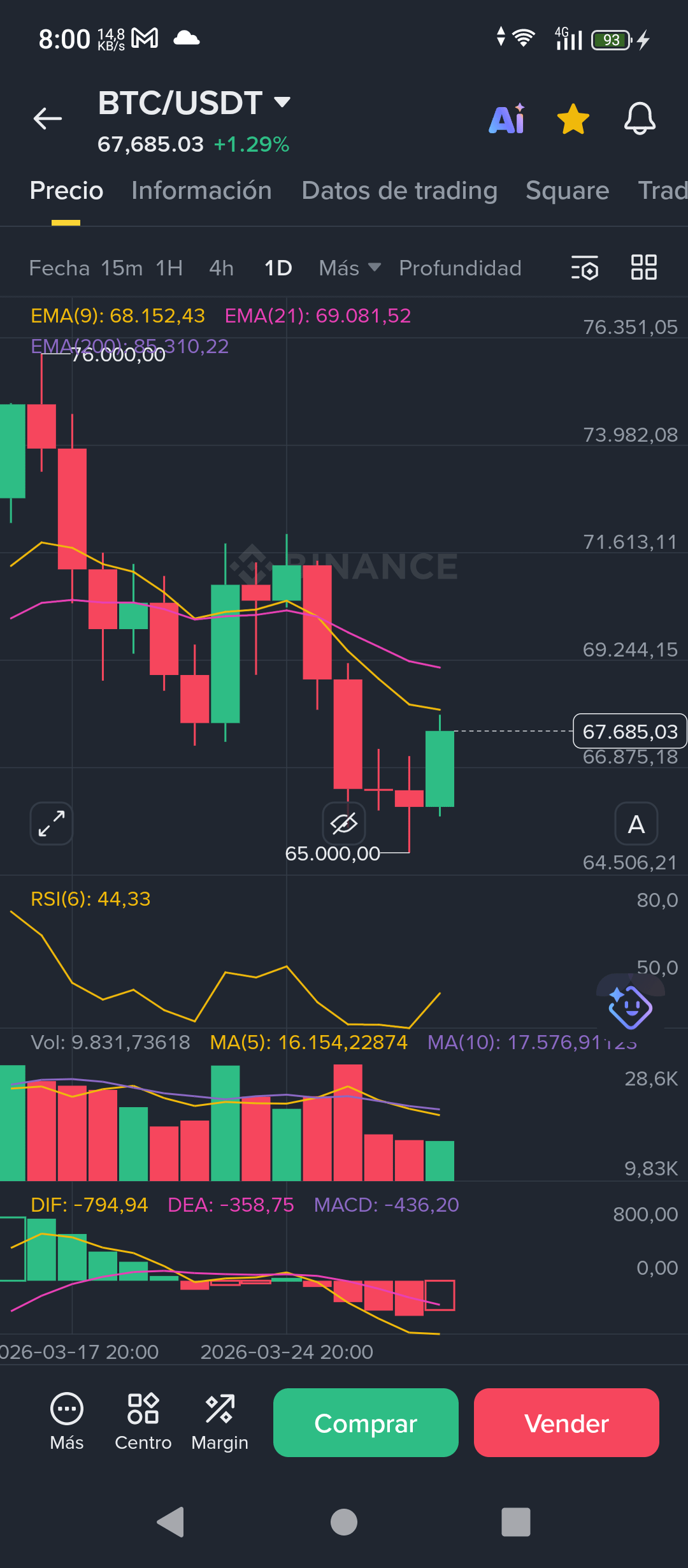 Técnica 1D: El rebote es fuerte. Estamos buscando recuperar la EMA 9 ($68,152) y la EMA 21 ($69,081). El RSI (44.33) se ha enfriado por completo tras el re-test, dándonos "combustible limpio" para volver a atacar los máximos.