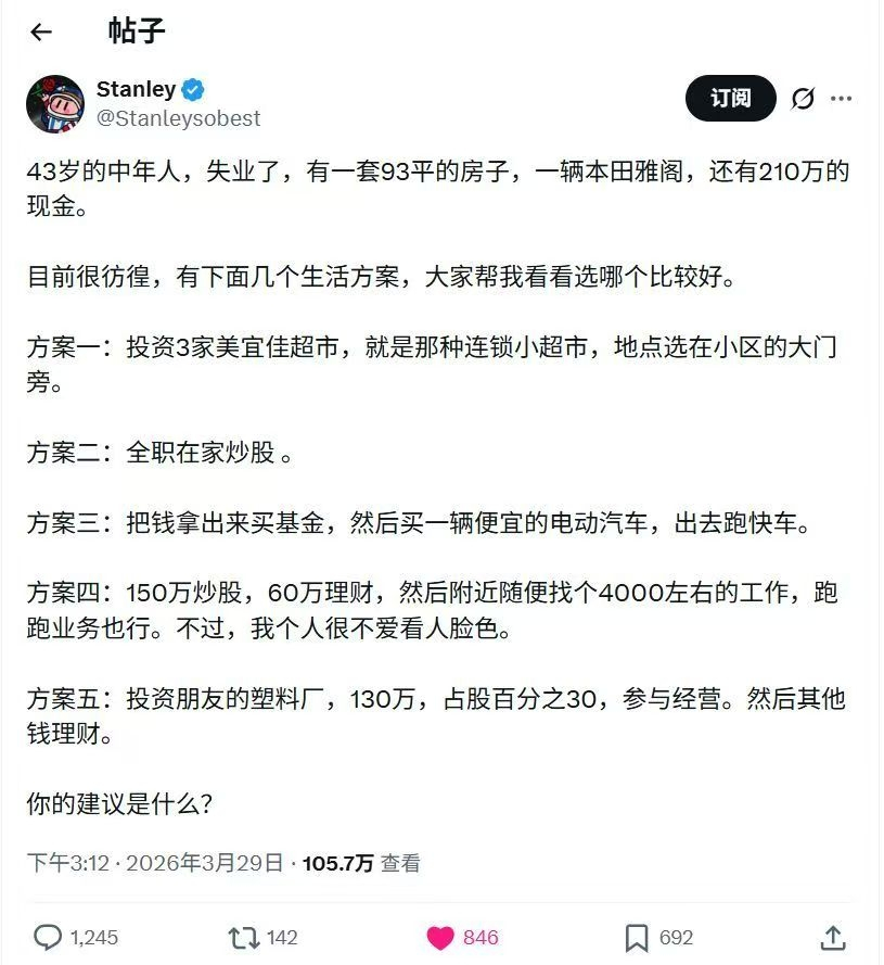 un hombre de mediana edad relata que tiene 43 años, está desempleado, tiene casa, coche y 2100000 de ahorros,