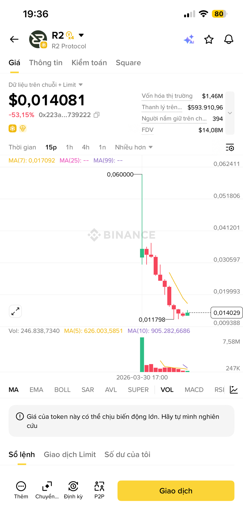 Những dự án như R2 thường có thanh khoản rất mỏng. Chỉ cần một vài lệnh bán lớn từ đội ngũ phát triển (Dev) hoặc các "cá mập" nắm giữ sớm là giá có thể chia đôi, chia ba trong vài phút.