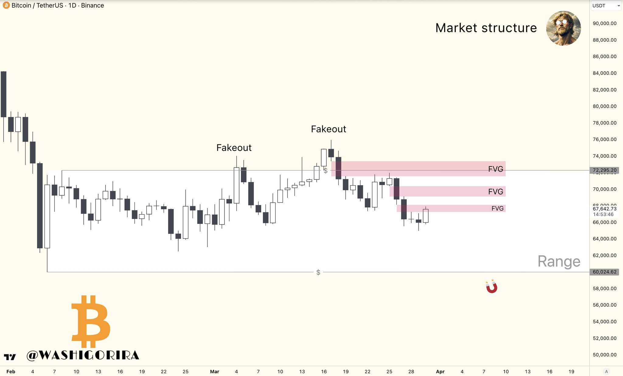 ¡Qué lo qué, mi gente! El Bitcoin está ahora mismo en un campo de batalla donde los toros y los osos se están dando con todo, y la gráfica no miente: estamos colgados de un hilo en los $65,800. 📉 Si te fijas en la imagen que tenemos en mesa, el precio viene haciendo "fakeouts" (esos amagues de ruptura que terminan en nada) cerca de los $74,000, dejando a más de uno atrapado arriba. Ahora, el precio está buscando imán en la liquidez de abajo, y esos espacios rosados que ves marcados como FVG (Fair Value Gaps) son huecos que el mercado tarde o temprano quiere ir a rellenar para equilibrar las cuentas. 🧲