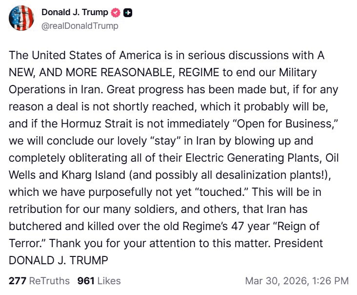 Tổng thống Donald Trump tuyên bố Mỹ đang tiến hành các cuộc đàm phán nghiêm túc với một "chính quyền mới, hợp lý hơn" tại Iran nhằm chấm dứt các hoạt động quân sự của Mỹ, cho biết đã đạt được nhiều tiến triển nhưng nếu không sớm đạt được thỏa thuận và nếu eo biển Hormuz không ngay lập tức được "mở cửa cho hoạt động", Mỹ sẽ kết thúc sự hiện diện của mình tại Iran bằng cách phá hủy hoàn toàn các nhà máy điện, giếng dầu và đảo Kharg, thậm chí có thể cả các nhà máy khử muối, những mục tiêu mà theo ông là Mỹ vẫn chưa đụng tới, đồng thời khẳng định đây sẽ là hành động trả đũa cho những binh sĩ và người khác của Mỹ đã bị Iran sát hại trong suốt 47 năm dưới chế độ cũ.