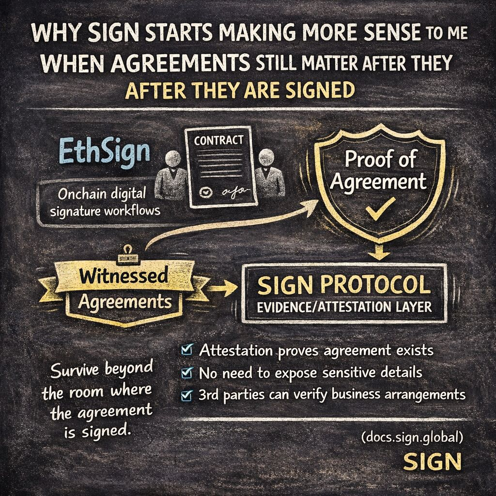 Because the harder problem is rarely the click that finalizes the agreement. The harder problem is what comes next. Maybe a lender needs to know a contract exists. Maybe access depends on a verified commercial relationship. Maybe another application needs proof of authorization without exposing the full document. If agreements stay trapped inside the exact system where they were created, every later step has to rebuild trust in a clumsy way. If there is a structured attestation that the agreement exists, then another layer can rely on that fact without restarting from zero. That is a much more serious use of infrastructure.