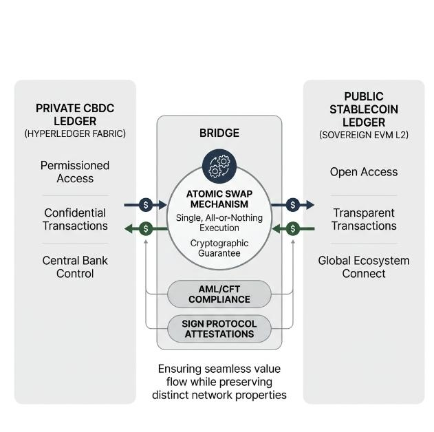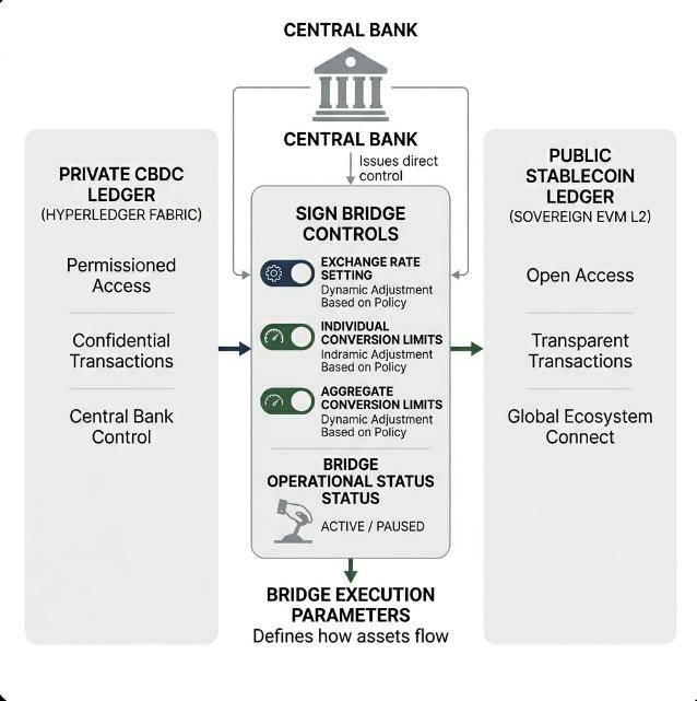 The stack deliberately runs two parallel rails. One is the Hyperledger Fabric X CBDC side permissioned, privacy-focused, and kept under direct central bank authority. It suits confidential transactions where full transparency could create risks. The other is the public sovereign EVM L2 running regulated stablecoins. Open, transparent, and able to connect with global digital ecosystems. Citizens and institutions often need to shift value between them. Maybe move CBDC holdings into stablecoin to access broader services, or pull stablecoin back into CBDC when privacy matters more.