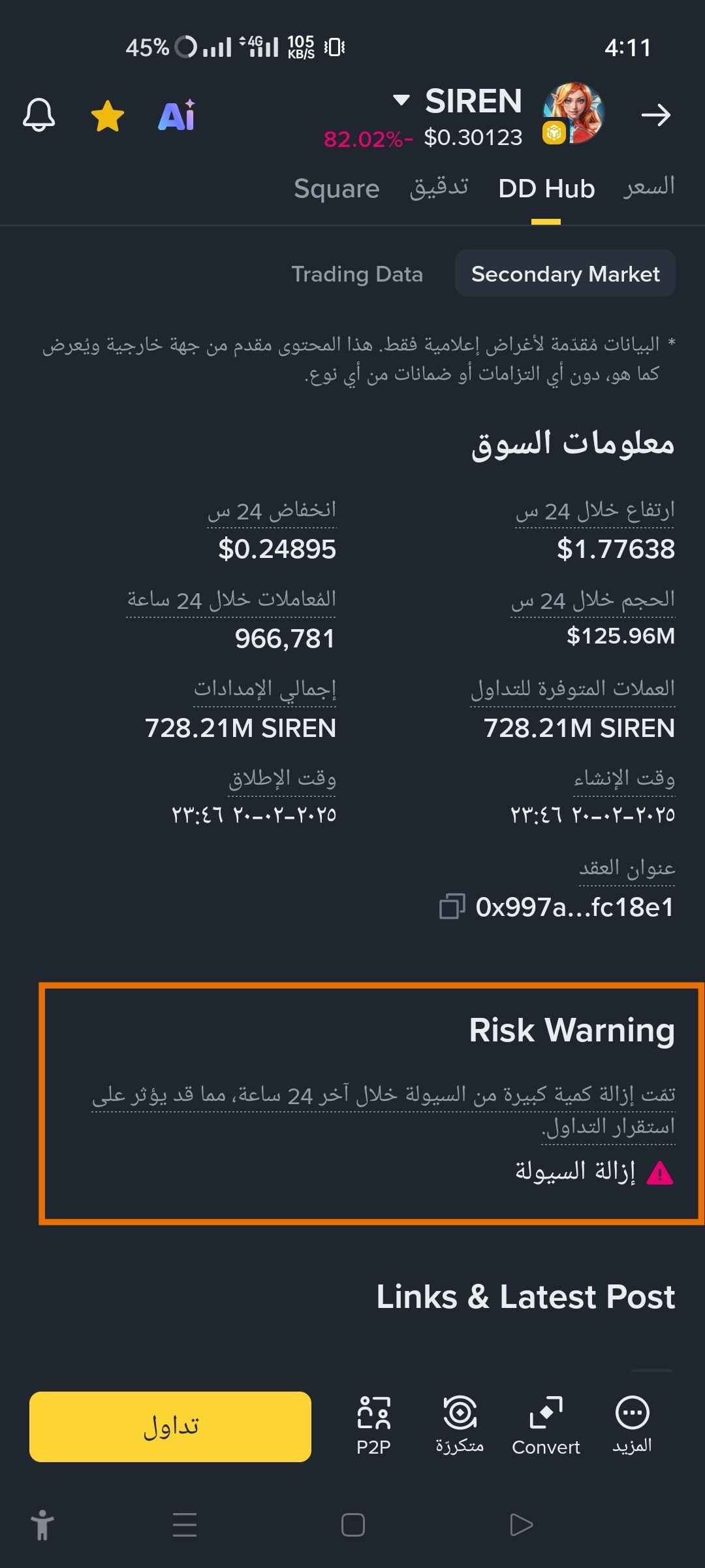 La tercera imagen revela la amarga verdad, la moneda se ha desplomado más del 82.02% para llegar a 0.30$ y lo más importante es la alerta de la plataforma de trading Binance