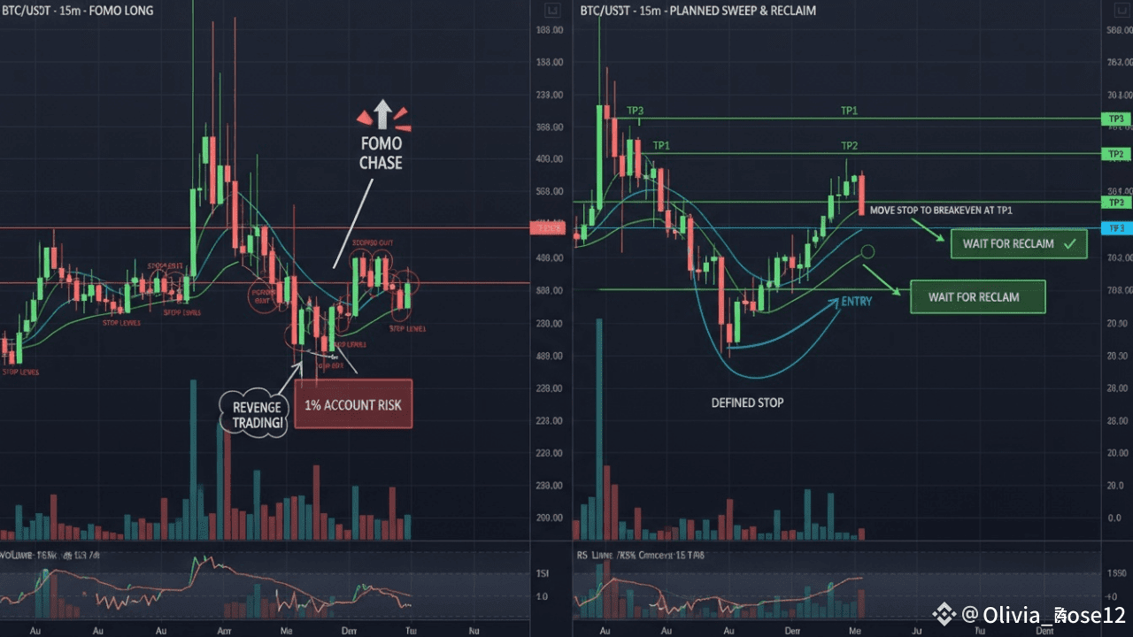 Reconstruye con reglas simples y aburridas que funcionen: arriesga el 0.5–1.0% de tu cuenta por operación, un máximo de tres pérdidas por día, sin nuevas operaciones después de un día de -2R, y no persigas velas verdes—entradas solo en niveles predefinidos con estructura y volumen. Usa una invalidación firme (el nivel que demuestra que estás equivocado) y dimensiona desde ahí: tamaño de posición = (cuenta × riesgo%) / (entrada – parada). Ejemplo: cuenta de $10,000, riesgo del 1% ($100), entrada 12.00, parada 11.60 → riesgo por unidad 0.40 → tamaño 250 unidades. Comercia pares líquidos (BTC/ETH) mientras recuperas tu ritmo; mantén monedas narrativas en un pequeño swing planeado con clara invalidación o siéntalas hasta que aparezcan configuraciones A+.
