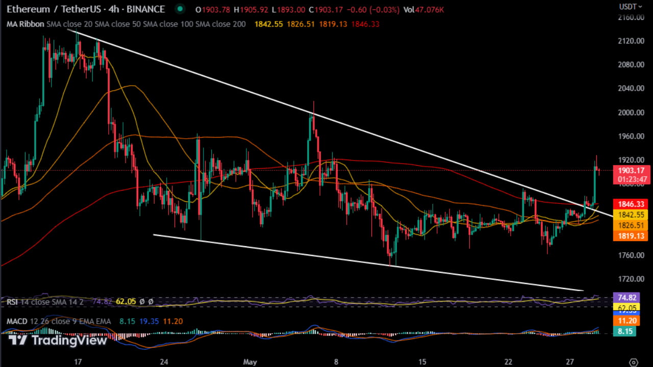 Al igual que Bitcoin, Ethereum, la segunda criptomoneda más grande, actualmente está demostrando un sólido impulso alcista luego de un rebote de soporte exitoso cerca del nivel de $1820.