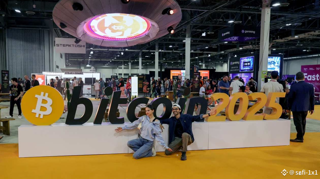 Des participants posent pour des photos devant un panneau lors de la Conférence Bitcoin à Las Vegas, Nevada en mai. Le monde du bitcoin était en émoi vendredi après la nouvelle que deux comptes dormants s'étaient réveillés après 14 ans.
