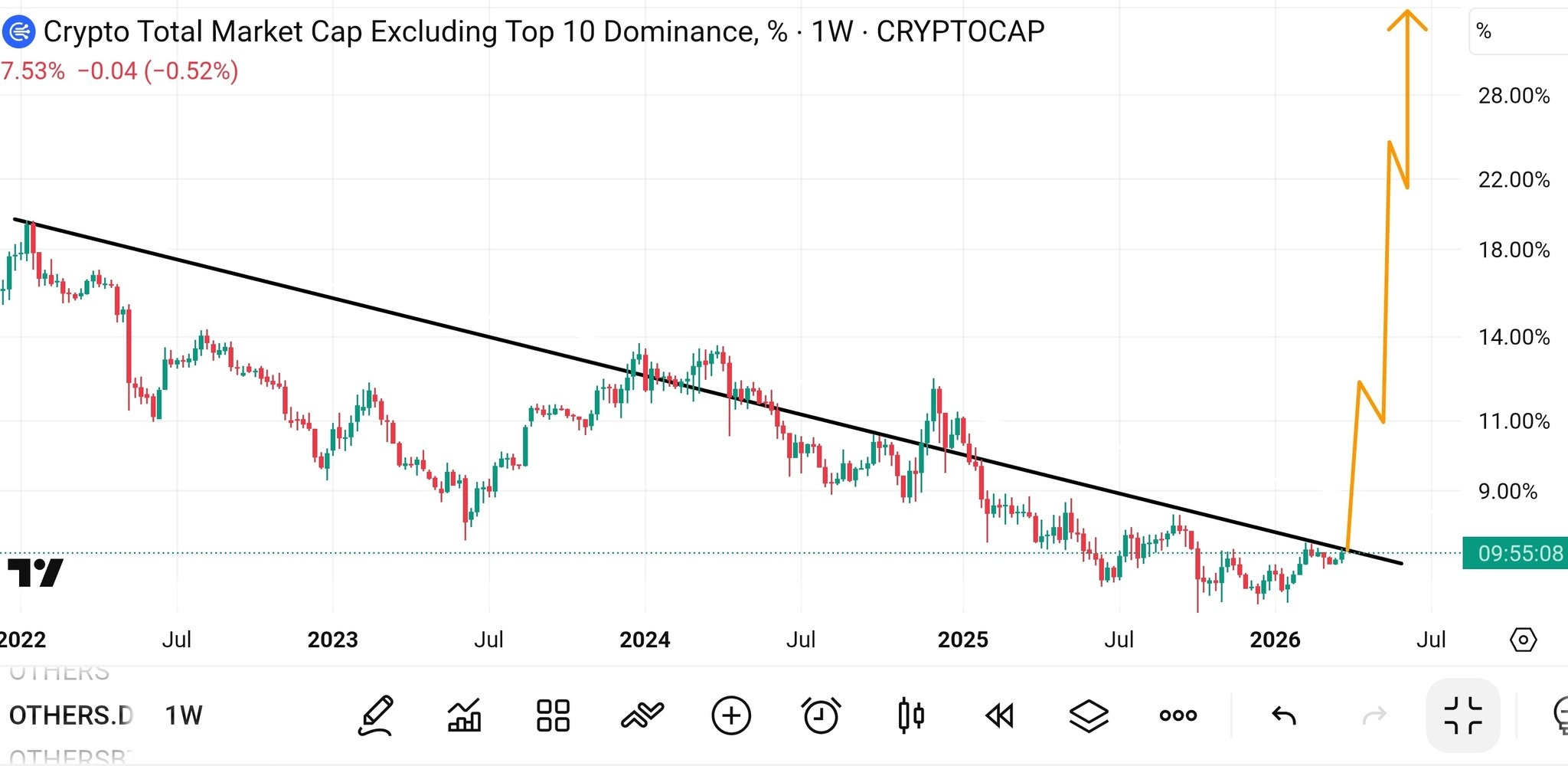 الشارت أمامك ليس مجرد خطوط وأرقام بل قصة ضغط متراكم لأربع سنوات كاملة على وشك الانفجار حيث إن مؤشر OTHERS الذي يقيس هيمنة العملات خارج أكبر 10 عملات في السوق ظل في قناة هبوطية منذ 2022 من 20% حتى أقل من 7.5% وهو الآن عند نقطة حسم تاريخية واختراقه في مطلع 2026 يعطي إشارة مبكرة على إعادة توزيع السيولة نحو الـ Altcoins لأنه يعكس مباشرة حركة الأموال في العملات المتوسطة والصغيرة المكان الذي تبدأ فيه الانفجارات الحقيقية 🔥