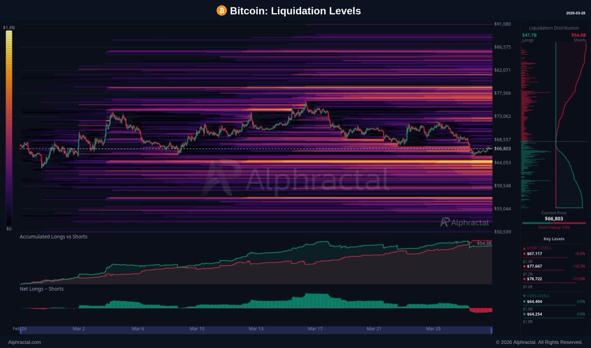 $1.8 milliard en liquidations longues assises à $64,254.