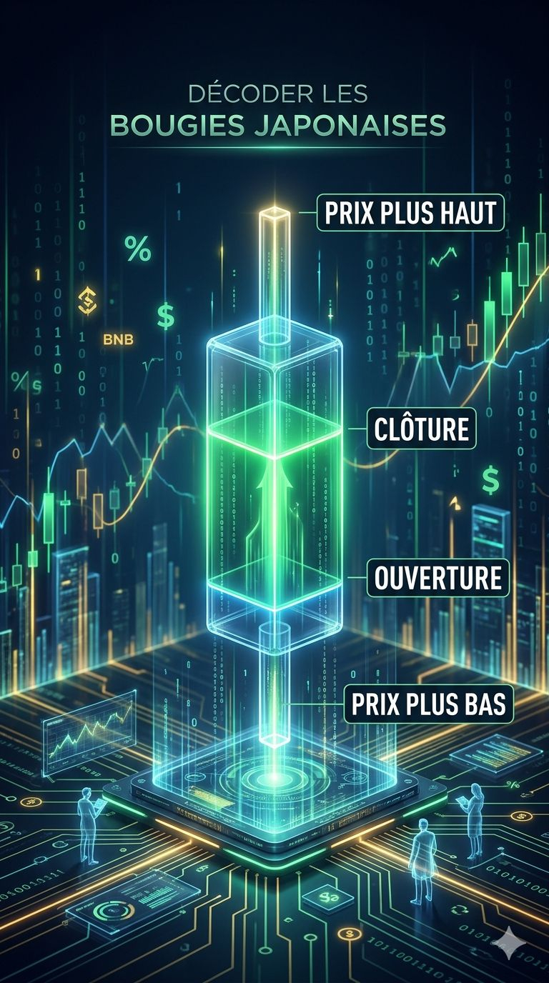 Une bougie n'est pas juste une couleur. Elle contient 4 informations capitales sur une période donnée (1h, 4h, 1 jour) :