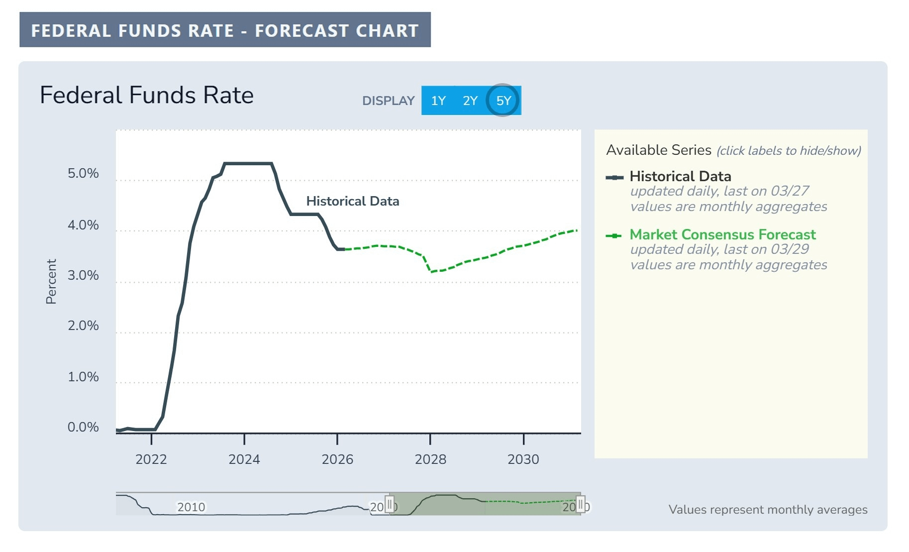 Vous verrez que cette prévision ne montre en fait jamais une grande baisse. Nous allons avoir une grande baisse. Je parierais là-dessus. Cela se produira lorsque les marchés vont craquer et que nous aurons une récession. C'est à ce moment-là que la Fed fera rapidement baisser le taux des fonds fédéraux. Ainsi, ce n'est pas intégré dans les prix car la Fed agit toujours trop tard. Ils sont réactionnaires.