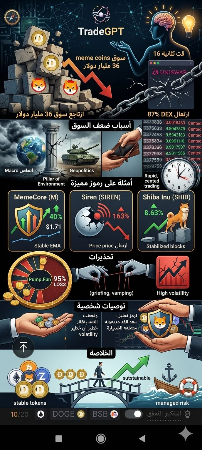💡 توصية مختصرة: سوق عملات الميم يشهد تقلبات كبيرة مع فرص محدودة للارتفاع المستدام. رغم بعض الارتفاعات في رموز مثل MemeCore و Siren، إلا أن السوق يعاني من ضعف السيولة، انخفاض المشاركة، وتأثيرات سلبية من ممارسات التداول السريعة والمضاربات. يُنصح بالحذر الشديد والتركيز على رموز ذات قصص قوية ودعم مجتمعي واضح، مع تجنب التداول العشوائي والمضاربة المفرطة.
