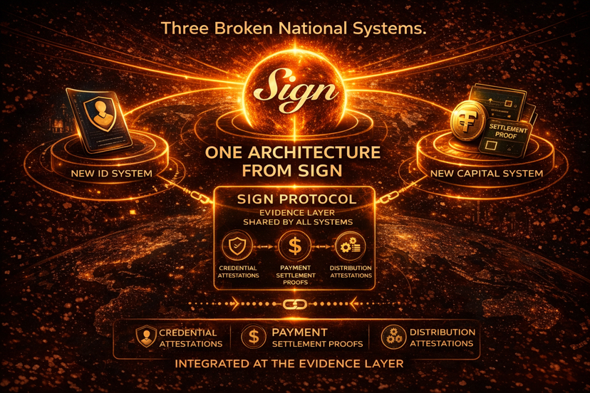 S.I.G.N. aborde la fragmentation à travers une décision architecturale spécifique que je pense sous-estimée. Les trois systèmes nationaux, Nouvelle Monnaie, Nouvelle ID, et Nouveau Capital, ne sont pas trois produits séparés qui se trouvent être regroupés. Ils sont conçus pour partager une couche de preuve commune. L'infrastructure d'attestation du protocole Sign fonctionne à travers les trois. Un identifiant émis dans le système de Nouvelle ID est lisible par le système de Nouveau Capital lors de la vérification de l'éligibilité à la distribution. Un paiement exécuté sur le système de Nouvelle Monnaie produit une attestation que le système de capital peut référencer comme preuve de règlement. Les systèmes sont véritablement intégrés au niveau de la preuve, pas seulement au niveau marketing.