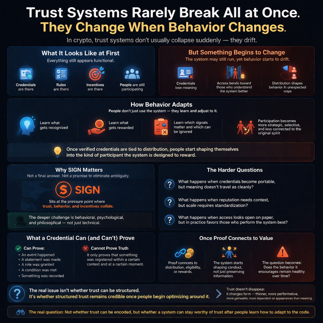 A place where crypto is being forced to confront a harder truth: trust systems are not judged only by how well they record reality. They are judged by how human behavior changes once reality becomes something people can learn to perform. The article ends in a very similar spirit, suggesting that what makes SIGN worth watching is not that it solves trust, but that it exposes where trust systems start bending under incentive pressure.