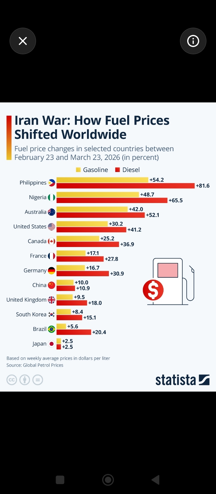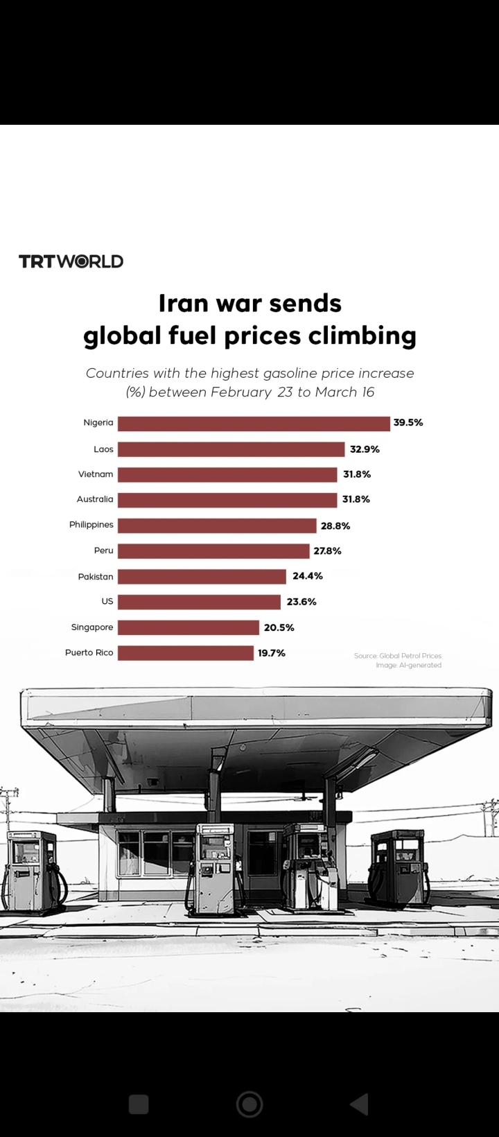 • Global petrol prices have climbed sharply in nearly 100 countries since the war began. �
