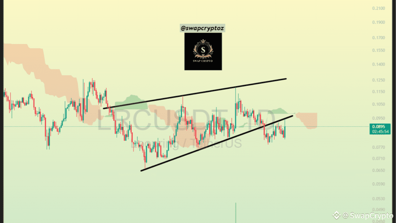 Ici, nous pouvons voir que ce graphique montre que le LRC se déplace à l'intérieur d'une wedge ascendante et vient juste de casser en dessous du support. Cela signale généralement une faiblesse, donc même avec un petit rebond maintenant, il semble probable que le LRC/USDT va encore chuter bientôt.