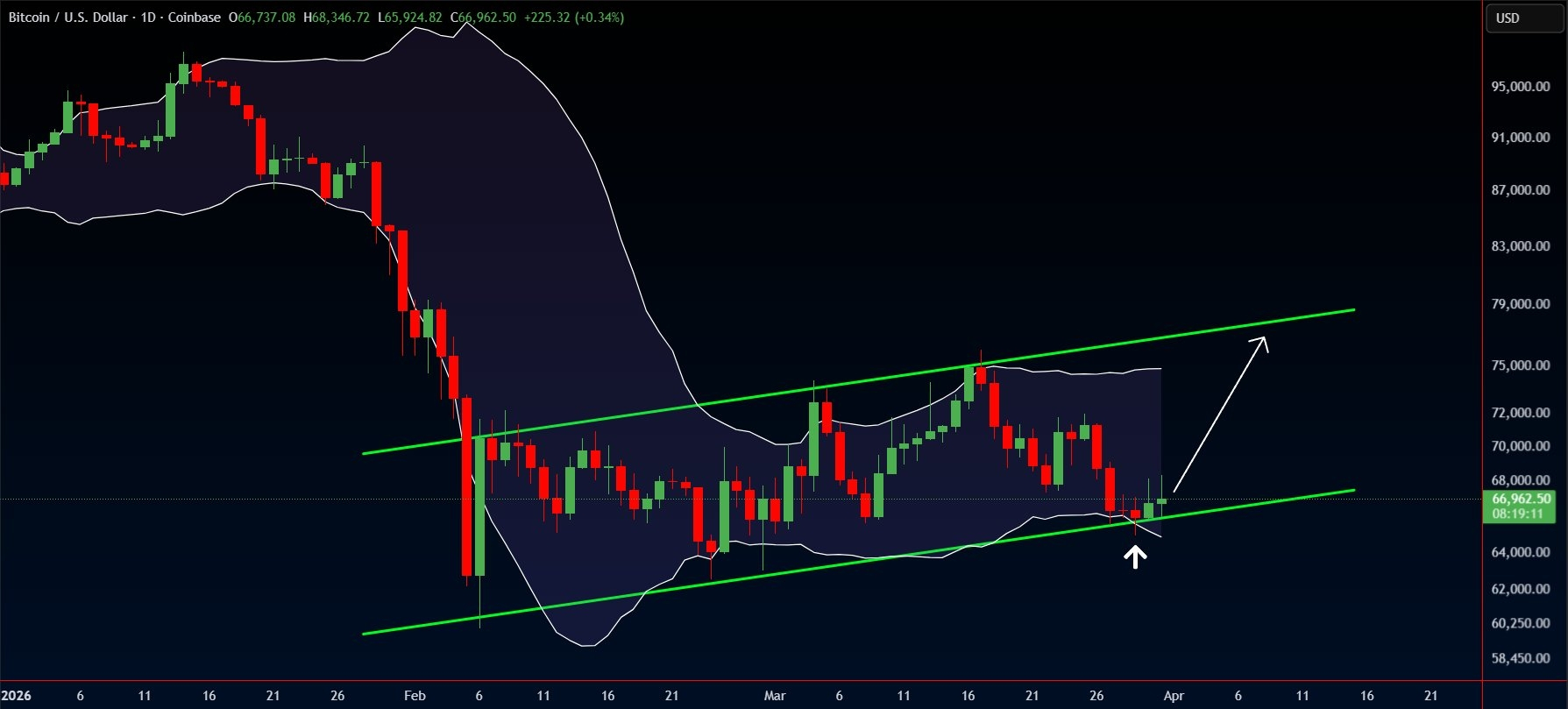 Quelle est la tendance maintenant ? Nous sommes trĂšs attachĂ©s Ă ce qui se passe avec le S&P 500 (la bourse amĂ©ricaine) ; s'ils montent, nous volons. Mais notez cette date : 3 avril. Ce jour-lĂ , les donnĂ©es sur l'emploi aux Ătats-Unis seront publiĂ©es, et cela sera l'arbitre qui dĂ©cidera si nous restons dans ce canal ascendant ou si nous devons retourner tester les 65.000 $ pour prendre de l'Ă©lan. Pour l'instant, le sentiment est optimiste, mais dans ce monde, celui qui s'endort se fait emporter par le courant.