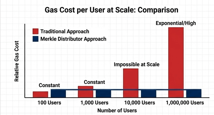 Sign Protocol is concept ko real world mein apne Merkle Distributor ke zariye use karta hai. Maan lo kisi project ko millions of users ko tokens distribute karne hain. Traditional approach mein har user ka allocation blockchain pe store karna padega, jo bahut expensive aur practically impossible ho jata hai. Par Merkle Distributor approach mein sirf ek cheez on-chain store hoti hai: Merkle Root, jo poori distribution list ka fingerprint hai. Jab koi user claim karta hai, toh woh apna address aur allocation amount dekar Merkle proof submit karta hai. Contract verify karta hai ki data root se match kar raha hai ya nahi. Iska sabse bada fayda yeh hai ki gas cost per user constant rehti hai, chahe total users kitne bhi hon. Ise aise samjho jaise ek company employees ko bonus de rahi ho. Unke paas ek master list hai jo public nahi hai. Tum HR ko apni ID aur verification code dete ho, aur system bina poori list expose kiye check kar leta hai. Yeh system already StarkNet, ZetaChain, aur Notcoin jaise projects mein use ho raha hai aur large-scale token distributions ke liye ek standard approach ban chuka hai.
