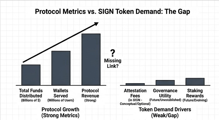 Lekin yahin se ek bada sawaal uthta hai ki aakhir SIGN token ka actual use kya hai? Current system mein token distribution ke liye SIGN token mandatory nahi hai, aur projects apne native tokens mein bhi fees pay kar sakte hain. Toh direct demand driver abhi clear nahi dikhta. Sign Protocol ka core vision sirf distribution nahi, balki on-chain attestations jaise identity, certificates, aur proofs create karna hai. Agar yeh attestation layer grow hoti hai aur fees SIGN mein charge hoti hain, tabhi token ki asli demand banegi. Ecosystem mein jitne zyada projects yeh infra use karenge, usage badhega, par usage aur token demand tabhi link honge jab fee model clear hoga. Future mein staking ya governance mechanisms bhi demand create kar sakte hain, par abhi yeh fully established nahi hain.