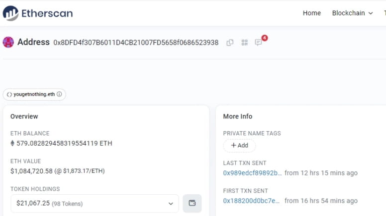 Au moment de la rédaction de cet article, les données d'Etherscan ont montré que le portefeuille avait plus de 579 ETH dans son solde.