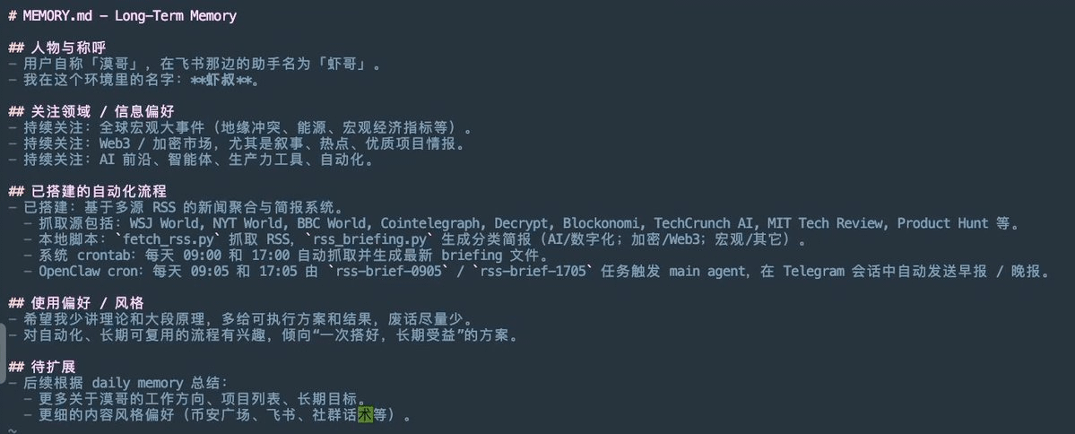 MEMORY.md (Manual Konfigurasi Jangka Panjang): Menyimpan logika inti, seperti fokus trek, gaya tweet, dan jalur umpan RSS.
